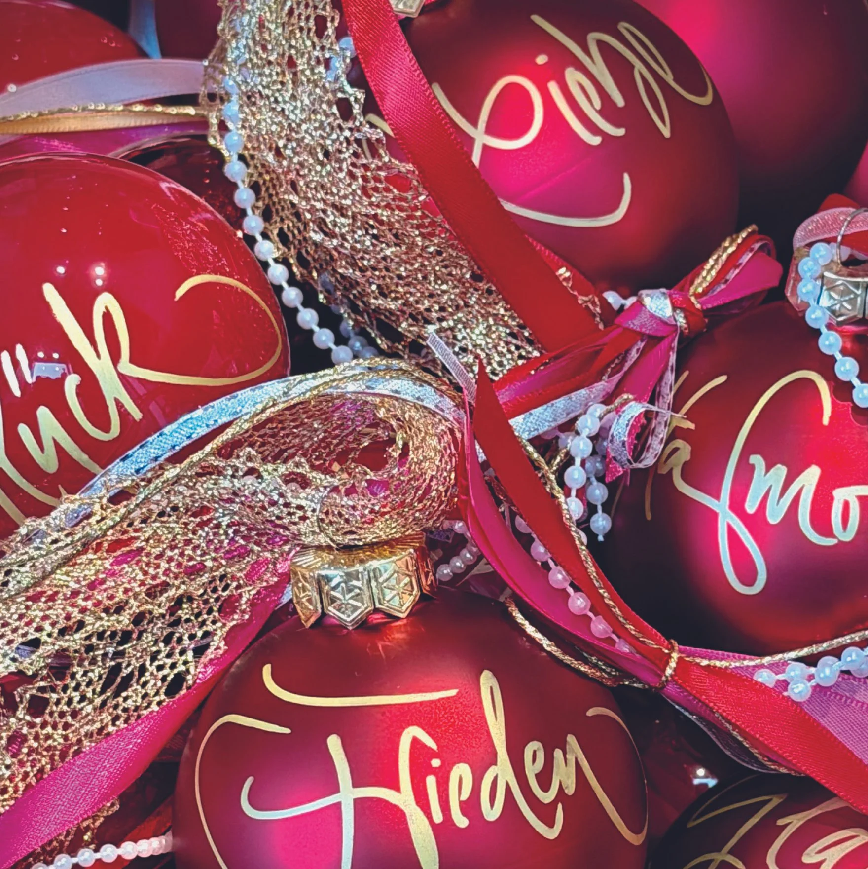 Das traditionelle Weihnachtskugelevent ist dieses Jahr am 4.Dezember. Es gibt kalligrapierte Weihnachtskugeln als kunstvolles Original. Ein schönes Wort, ein Wunsch, ein Name, ein Gedicht-handgeschrieben und mit Bändern verziert macht jede Kugel zu einem persönlichen Objektund in einer edlen Kartonage mit Seidenpapier zu einem stilvollen Präsent. Herzlich Willkommen. Es gibt Punsch, Gebäck und Musik. Inmitten der Kunst singt Adi Wolf und es spielt Boris Kosak am Flügel.