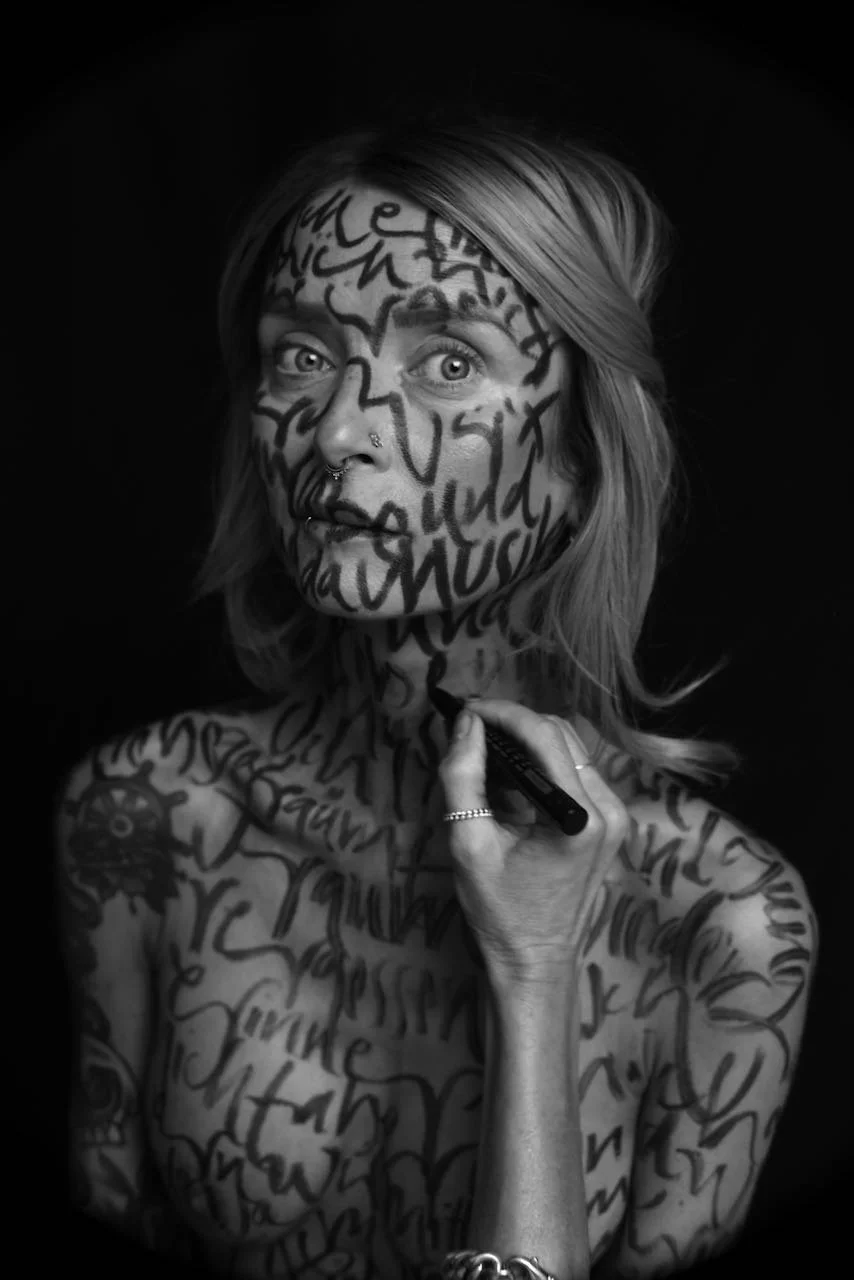 In ihrem Kunstprojekt machen Jeannine Platz und wieglas Musik sichtbar. Sie treffen Musiker aus aller Welt, die sich einen besonderen Song aus ihrem Repertoire auf die Haut kallligraphieren lassen. Eingetaucht in Text und Melodie des Stückes kreiert Jeannine Platz Zeile für Zeile und benutzt den Körper als lebende Leinwand. Sie nimmt die Stimmung des Liedes in sich auf und transformiert sie in Farbe und Buchstabenschwünge auf das Gesicht, Hände, Unterarme, Rücken oder auf den ganzen Körper. wieglas hält die Essenz der sichtbar gewordenen Musik fotografisch fest, immer dabei seinem geheimnisvollen Stil treu bleibend. So wird die Kunst am Körper zu einem Moment immerwährender Ewigkeit. THE VOICE ON MY SKIN vereint die Fotografien in einer Ausstellung und einem Bildband, die beim Betrachten die Musik aus allen Genres zum Erklingen bringt.