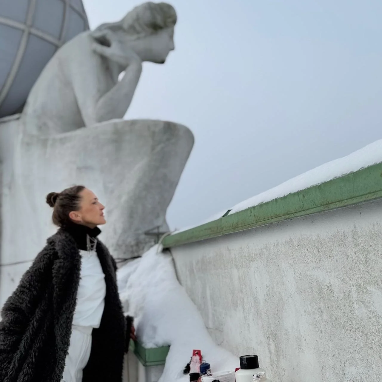 Für ihre Wolkenserie bezieht Jeannine Platz eine Suite mit Alsterblick in das Hotel Atlantic. Als Artist in Residence steigt sie auf das Dach, was sonst nur Udo Lindenberg und James Bond vergönnt ist und malt das, was sie sieht und fühlt. Hier oben herrscht Stille. Weit unten in der Ferne liegt die Stadt. Ganz nah die Engel und die Kugel der Welt. In dieser Kulisse entsteht das erste Bild der Ausstellung, die im Hotel Atlantic zu sehen sein wird.