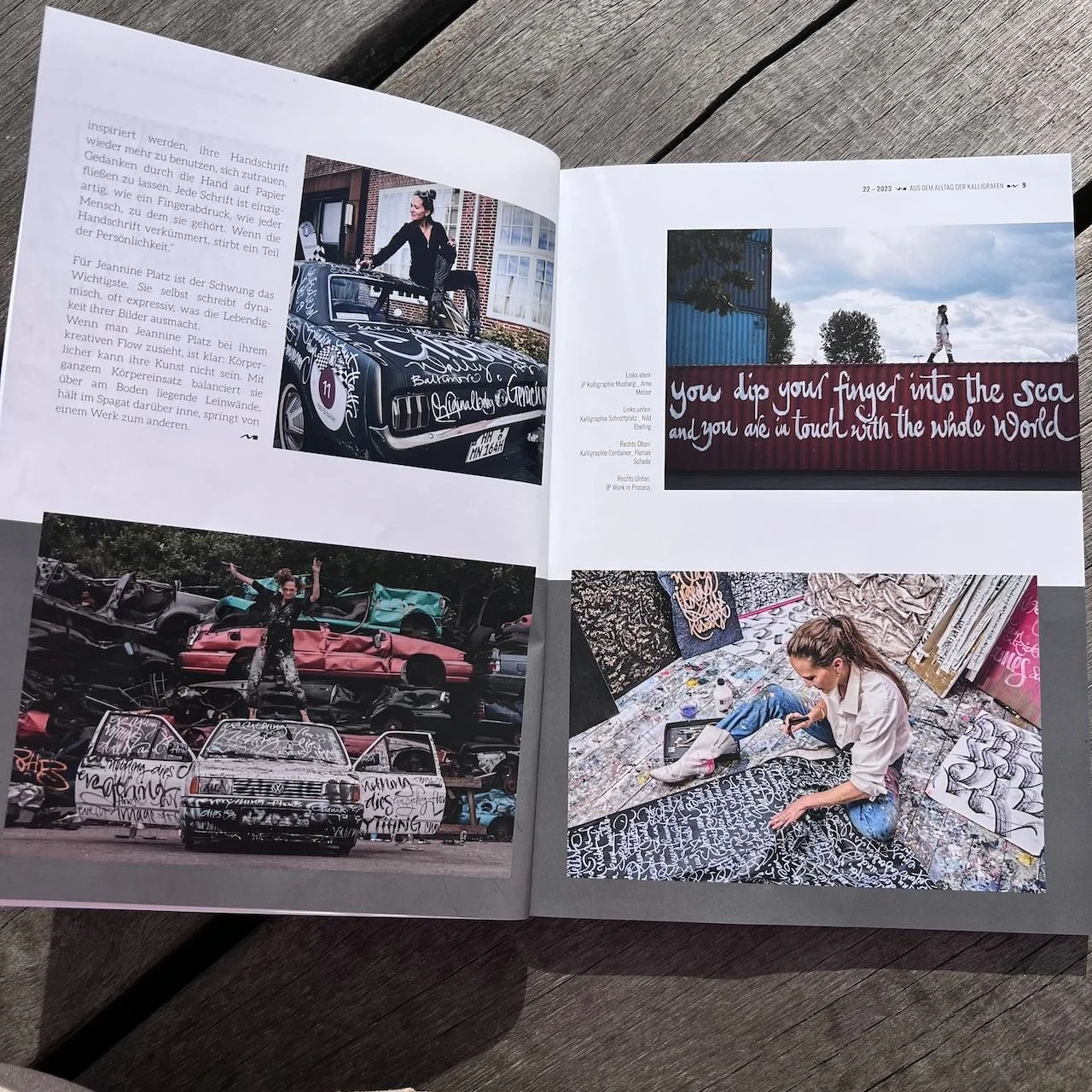 Die Malerei ist ein Teil ihres künstlerischen Schaffens. Ein anderer Teil die Kalligrafie. Die Kunst des Schönschreibens inspiriert Jeannine Platz seit ihrer Kindheit und seitdem kreiert sie schwungvoll von großformatigen Schriftbildern bis zu filigransten Stücken poetische Texte. Jedes Werk ein Unikat, von Ornament bis Buchstabe, vom kräftigen Strich bis zur puren Feinheit, macht das Lesen zu einem fesselnden Erlebnis. Für internationale Unternehmen wie Montblanc und Chanel schreibt sie seit 20 Jahren Einladungen, Tischkarten und sämtliche Papeterie. Die Referenzliste der Unternehmen ist lang und das bestärkt Jeannine Platz, dass die Handschrift in der Gesellschaft immer mehr wertgeschätzt wird. Dieses wichtige Kulturgut darf niemals abhandenkommen", dafür setzt sich die Künstlerin ein und widmet eine ganze Ausstellung dem geschriebenen Wort in der Barlach Halle K. WORDS IN MOTION heißt ihre Hommage an die Handschrift und Jeannine inszeniert darin ihre Liebe zur skripturalen Kunst: großformatig auf handgeschöpf-ten Papieren, auf Leinwand, Kunstleder, Seide, Metall, auf Autos, auf Menschen. Die Vernissage wurde am 5. Juli um 19 h im großen Stil eröffnet. Geladene Gäste folgten der kunstvoll handgeschriebenen Einladung und betraten über den pinken Teppich die Welt der Kalligrafie, in der es nichts gibt, was Jeannine Platz nicht mit ihrer Handschrift veredeln könnte. Als besonderes Highlight wartete mitten in der Barlach Halle K ein hochwertig schwarzer Schimmel vom Pianohaus Trübger auf seine ganz persönlichste Note, und wurde zu einem Kunstwerk und zum Teil der ausgestellten Exponate. Eröffnet wurde die Ausstellung mit einer Liebeserklärung an das Briefeschreiben mit einem von Jeannine Platz produzierten Kurzfilm DIE SEELE AUF PAPIER. Ich möchte, dass die Menschen durch meine Ausstellunginspiriert werden, ihre Handschrift wieder mehr zu benutzen, sich zutrauen, Gedanken durch die Hand auf Papier fließen zu lassen. Jede Schrift ist einzigartig, wie ein Fingerabdruck, wie jeder Mensch, zu dem sie gehört. Wenn die Handschrift verkümmert, stirbt ein Teil der Persönlichkeit." Für Jeannine Platz ist der Schwung das Wichtigste. Sie selbst schreibtm dynamisch, oft expressiv, was die Lebendigkeit ihrer Bilder ausmacht. Wenn man Jeannine Platz bei ihrem kreativen Flow zusieht, ist klar: Körperlicher kann ihre Kunst nicht sein. Mit ganzem Körpereinsatz balanciert sie über am Boden liegende Leinwände, hält im Spagat darüber inne, springt von einem Werk zum anderen.