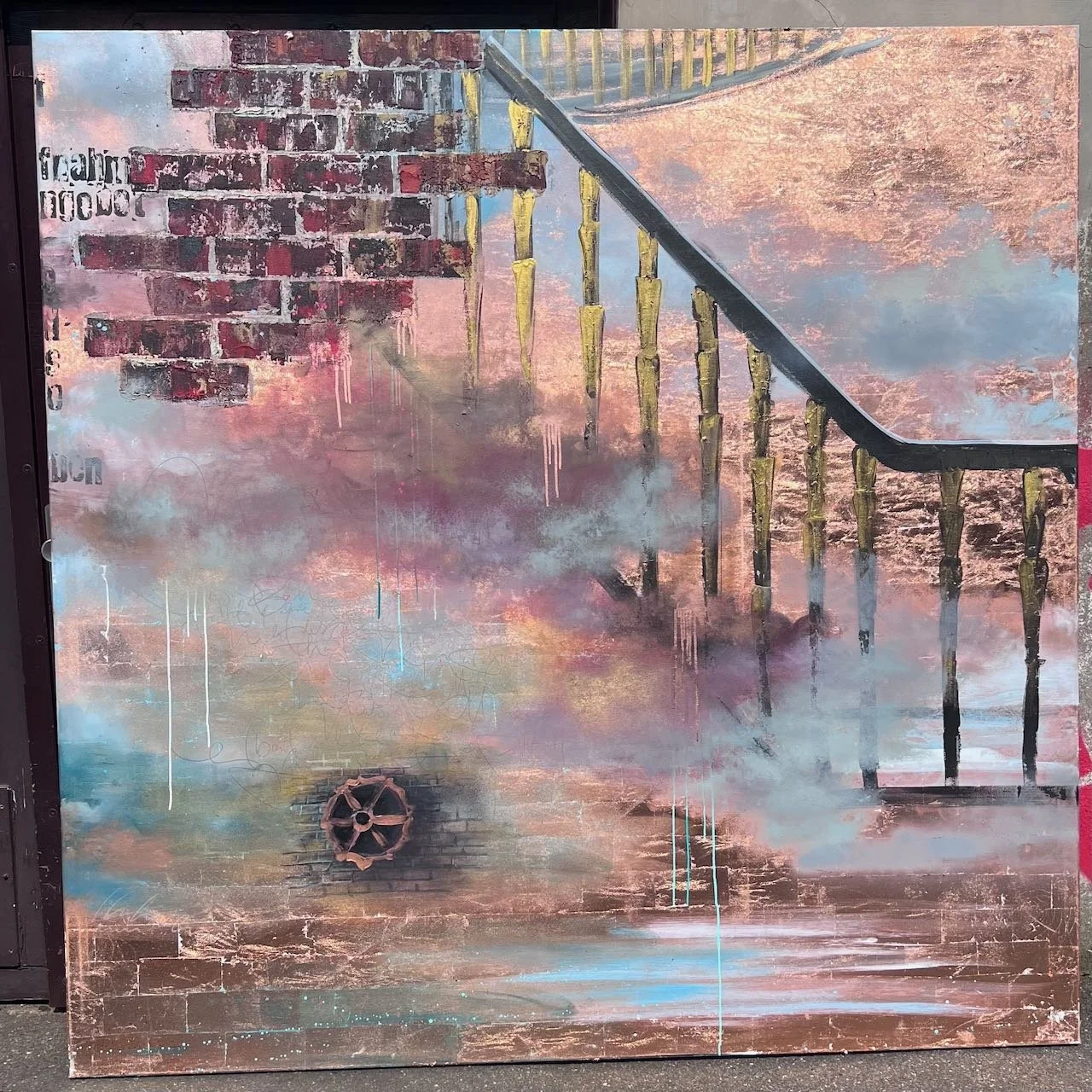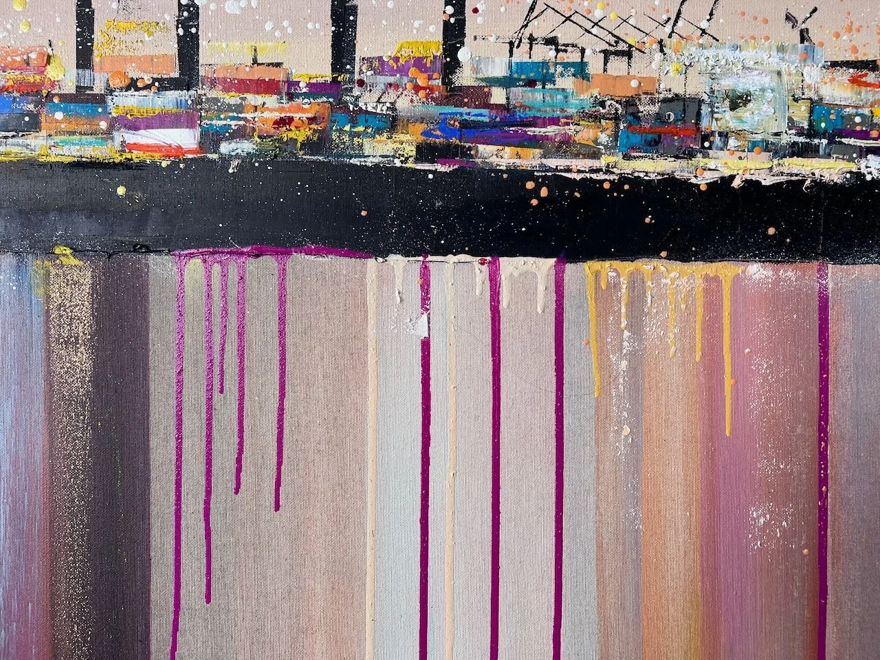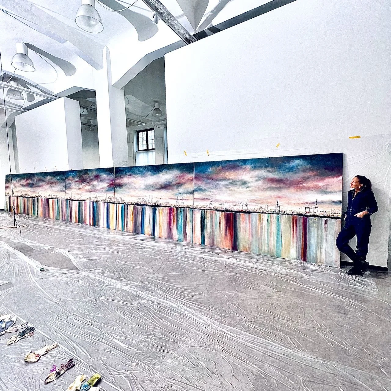 Das erste THE CLOUD ONE Hotel in Europa, das Zweite nach Eröffnung in New York - zieht in das Kontorhausviertel. Und die Frage, wer sich am Besten für die Kunst im Haus nah des Hafengeschehens eignet, ist schnell mit Jeannine Platz beantwortet. Somit beginnt die künstlerische Kreation der Hotellobby mit Werken von epischen Dimensionen in unverwechsellbarem Stil der Künstlerin: Eine 15 m x 2 m abstrakte Hafensilhouette als Pentaptychon. Für die Entstehung zieht Jeannine Platz in die Barlach Halle K, um den Tanz aus Nähe und Abstand zu den Bildern mit Leichtigkeit zu meistern. In einer anderen Halle malt sie an einzelnen Leinwänden, schiebt sie zusammen, schwebt mit einer Schaukel über dem Schaffensprozess, um aus verschiedenen Perspektiven zu malen.