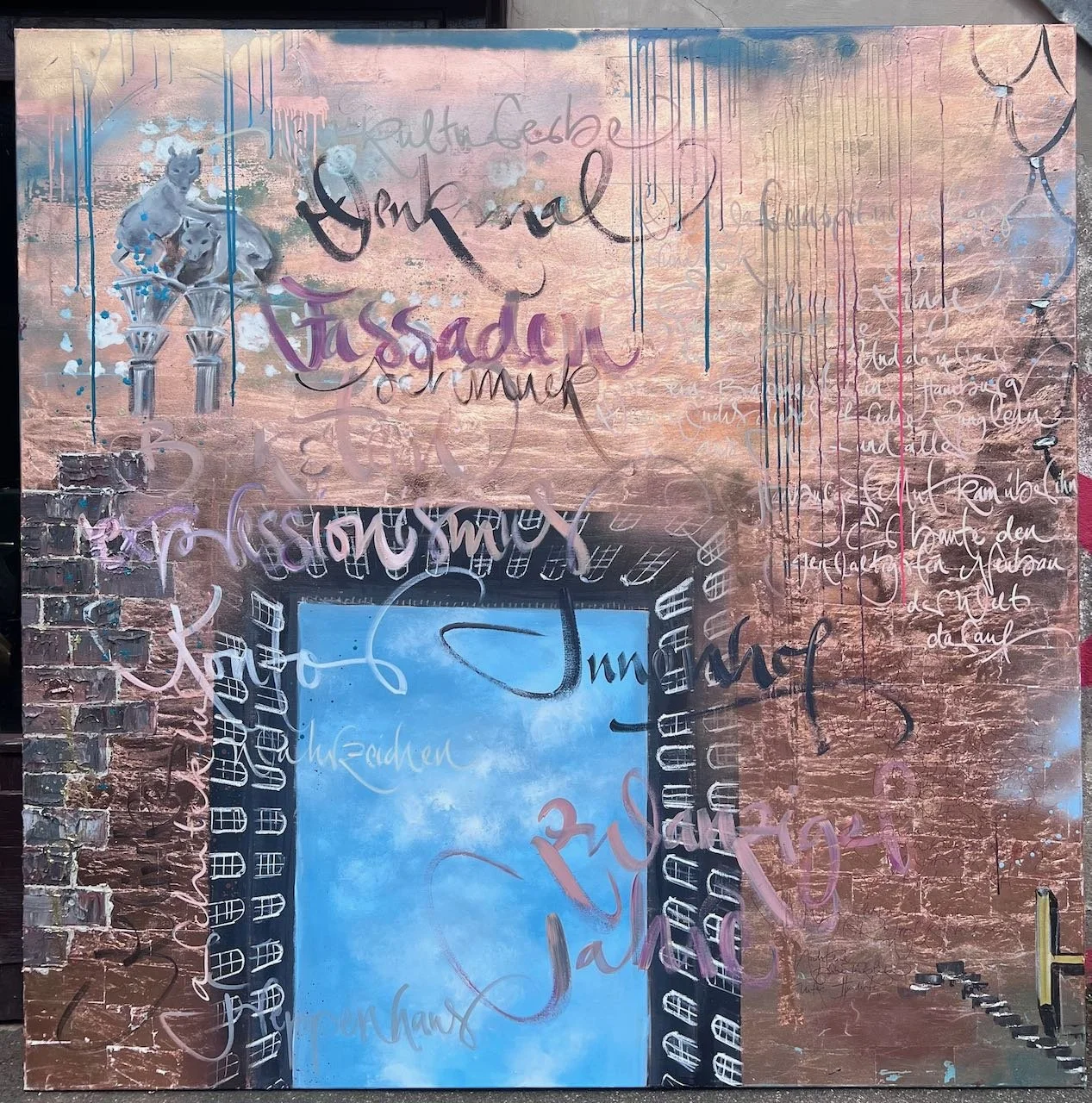 Ein 8 x 4 m Werk hängt über dem Empfang und besteht aus einer Collage der Kontorhausviertelgeschichte, gemalt auf 2000 Blattkupferblättchen. Lässt man den Blick über das Gesamtwerk schweifen, endeckt man Symbole des Backsteinexpressionismus, Fassadenschmuck, Wendeltreppen, Ornamente und Kalligraphie der historischen Texte.