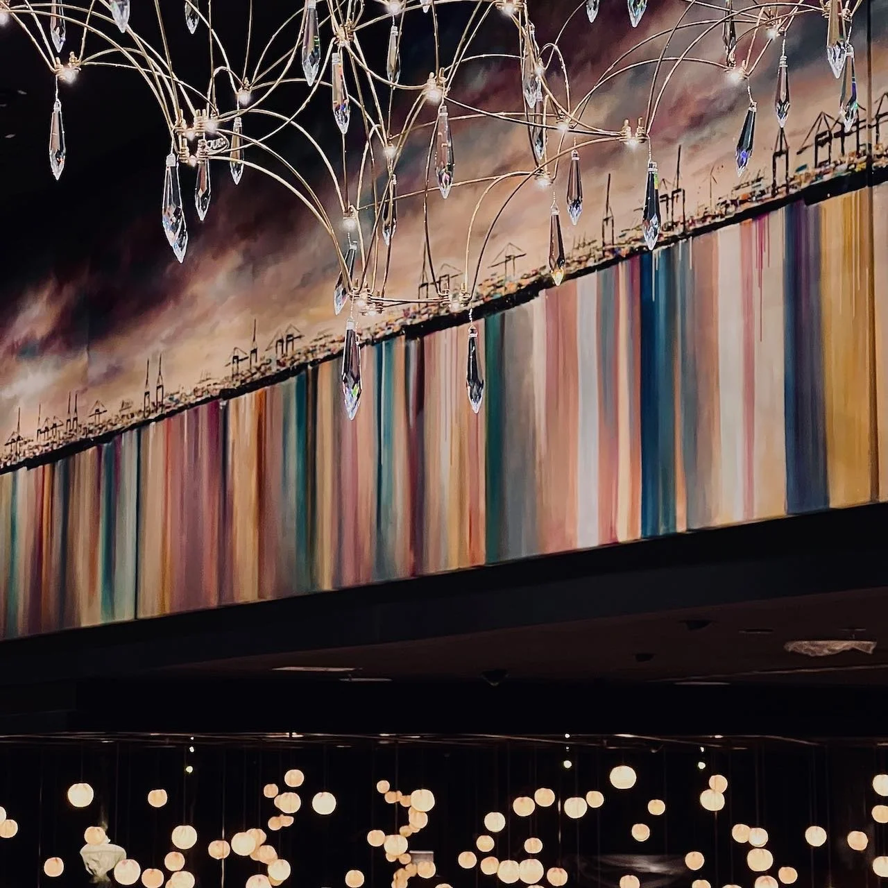 Eine 15 Meter lange weiße Leinwand, die sich mit einer Handvoll Farbe mit Leben füllt. Das 5-teiliges Pentaptychon ergibt ein Hafenpanorama, das mit der Bar harmoniert.