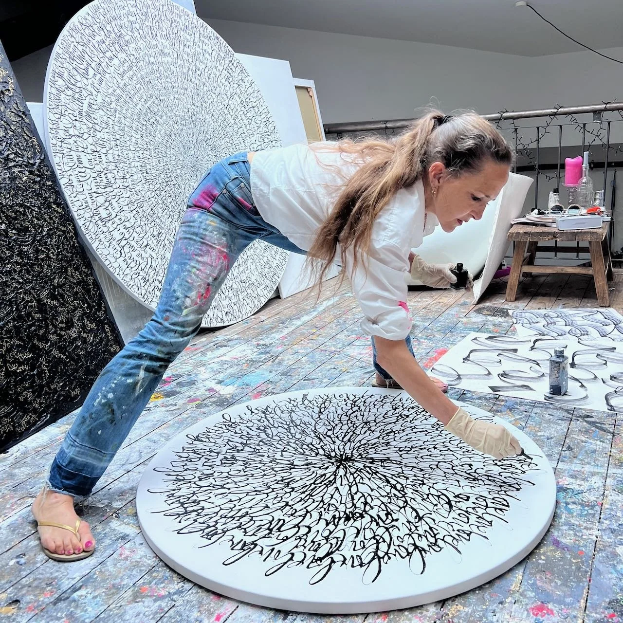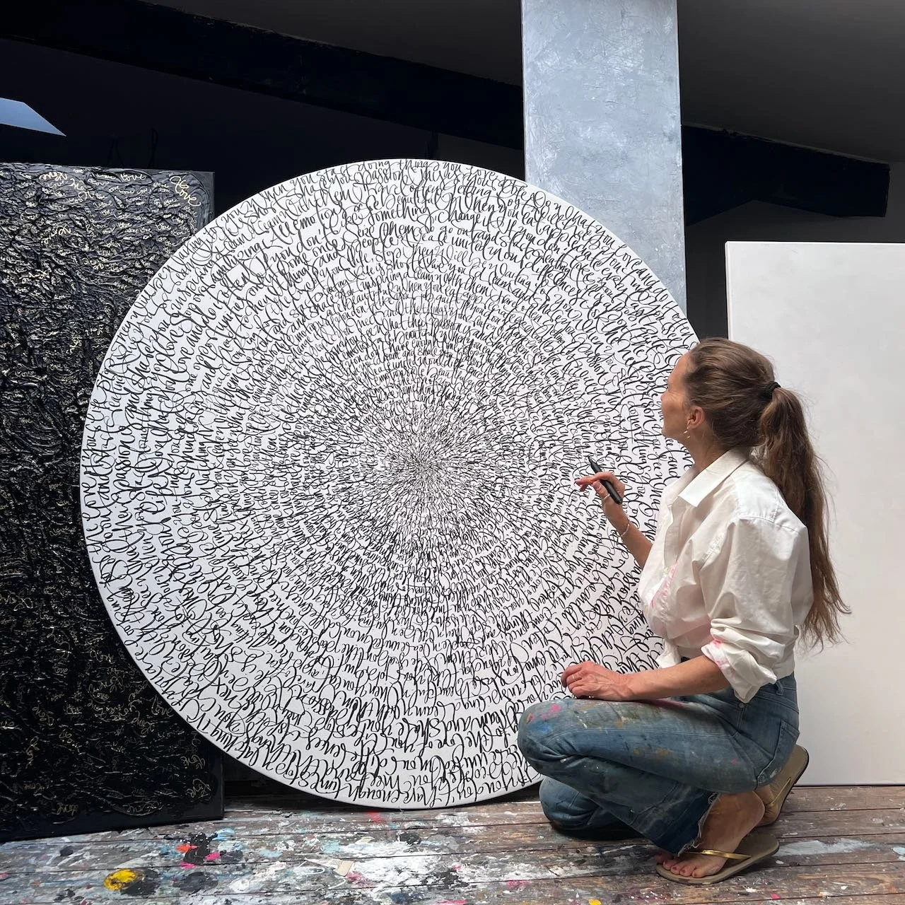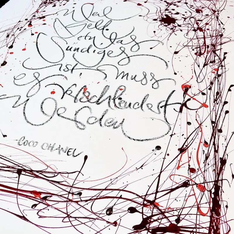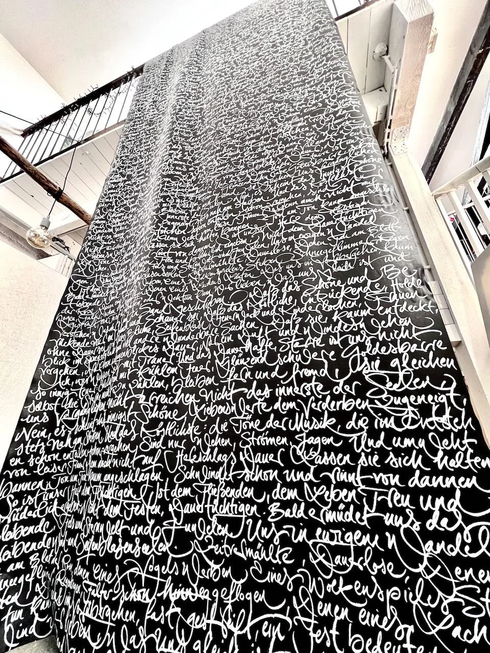 Jedes Werk ein Unikat, von Ornament bis zum Buchstaben, vom kräftigen Strich bis zur puren Feinheit macht das Lesen zu einem fesselnden Erlebnis. Für internationale Unternehmen wie Montblanc und Chanel schreibt sie seit 20 Jahren Einladungen, Tischkarten und sämtliche Papeterie. Die Referenzliste der Unternehmen ist lang und das bestärkt Jeannine Platz, dass die Handschrift in der Gesellschaft immer mehr wertgeschätzt wird. „Dieses wichtige Kulturgut darf niemals abhandenkommen“, dafür setzt sich die Künstlerin ein und widmet eine ganze Ausstellung dem geschriebenen Wort in der Barlach Halle K. WORDS IN MOTION heißt ihre Hommage an die Handschrift und Jeannine Platz inszeniert darin ihre Liebe zur skripturalen Kunst: Großformatige Kunst auf handgeschöpften Papieren, auf Leinwand, Kunstleder, Seide, Metall, auf Autos, auf Menschen.